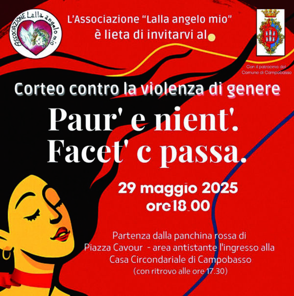 “Paur’ e nient’. Facet’c passa’” non è solo uno slogan, ma un grido collettivo contro la violenza di genere: così l’associazione Lalla Angelo Mio aps, da sempre in prima linea per i diritti delle donne, invita tutta la cittadinanza a partecipare al primo corteo contro la violenza di genere organizzato in Molise, con il patrocinio […]
