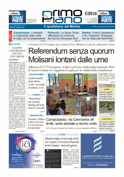 Al voto per i cinque referendum, quattro in materia di lavoro e uno sulla cittadinanza italiana, si è recato il 27,7% dei molisani aventi diritto. Dato inferiore a quello medio nazionale, pure drammaticamente sotto la soglia del 50%: 30,6% Il quorum in Molise non è stato raggiunto in nessuno dei 136 Comuni della regione. Il […]