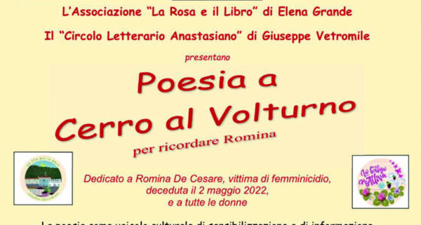 Si svolgerà domani, sabato 30 agosto, a partire dalle ore 18:30 nel magnifico scenario ai piedi del Castello Pandone in Piazza Santa Maria nel borgo antico di Cerro al Volturno, l’incontro di poesia dedicato alla giovane cerrese Romina De Cesare, vittima di femminicidio dal suo compagno il 2 maggio del 2022 a Frosinone, la sera […]