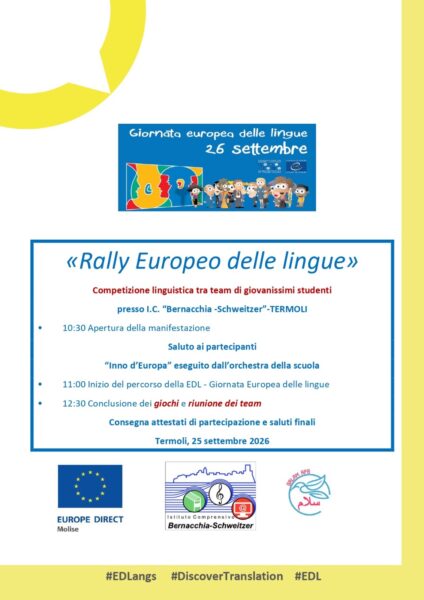 Anche quest’anno, come da tradizione, sono diverse le scuole del Molise che celebreranno la Giornata europea delle lingue. Europe Direct Molise desidera ringraziare tutte le istituzioni coinvolte, in particolare quelle che hanno accettato di organizzare iniziative e hanno collaborato attivamente con il Centro nelle fasi organizzative e gestionali.