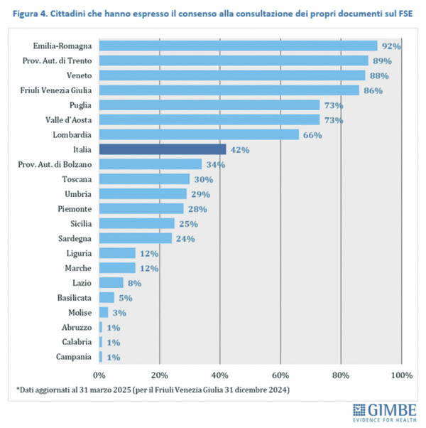 In Campania il quadro non migliora: 10 documenti su 16 disponibili (63%), servizi accessibili pari al 18%, e una delle più basse percentuali di utilizzo da parte dei cittadini (10%). Solo l’1% ha espresso il consenso alla consultazione. I medici di famiglia utilizzano il FSE nell’88% dei casi, ma solo il 61% degli specialisti è abilitato.