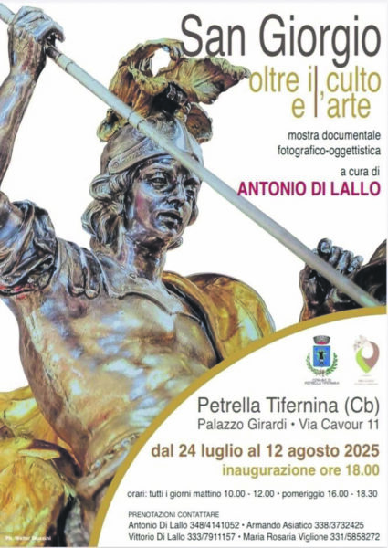 Un itinerario straordinario tra fede, arte, cultura e società contemporanea: è quanto propone la mostra “San Giorgio: oltre il culto e l’arte”, che sarà inaugurata giovedì 24 luglio 2025 alle ore 18 presso Palazzo Girardi, in via Cavour 11 a Petrella Tifernina. Curata da Antonio Di Lallo, l’esposizione sarà visitabile fino al 12 agosto, tutti i giorni dalle 10 alle 12 e dalle 16 alle 18.30.